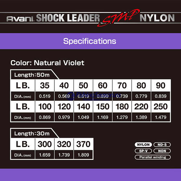 Avani Shock Leader SMP Nylon благодаря специальному покрытию «NON» (non-stress), которое еще лучше защищает от впитывания воды, ультрафиолета, перепада температур, а также обработке «ND-S», отвечающей за гибкость, натяжение и жесткость, стал намного прочнее и долговечнее по сравнению со старыми моделями.